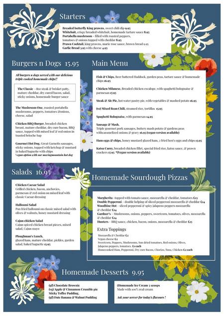 Here are some examples of our menus, please note these are subject to regular changes, please phone ahead to confirm item availability and we will try and make sure its available for you!